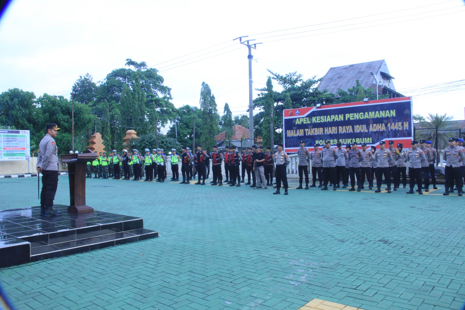 FOKUSMEDIANEWS.COM, KAB SUKABUMI – Kapolres Sukabumi AKBP Tony Prasetyo memimpin apel Personel gabungan untuk persiapan Pengamanan Malam Idul Adha, di halaman mapolres Sukabumi, Minggu (16/6/2024). Apel tersebut digelar untuk memastikan kesiapan personil dalam menjaga keamanan dan kelacaran malam takbiran serta sholat Idul Adha 1445 H.