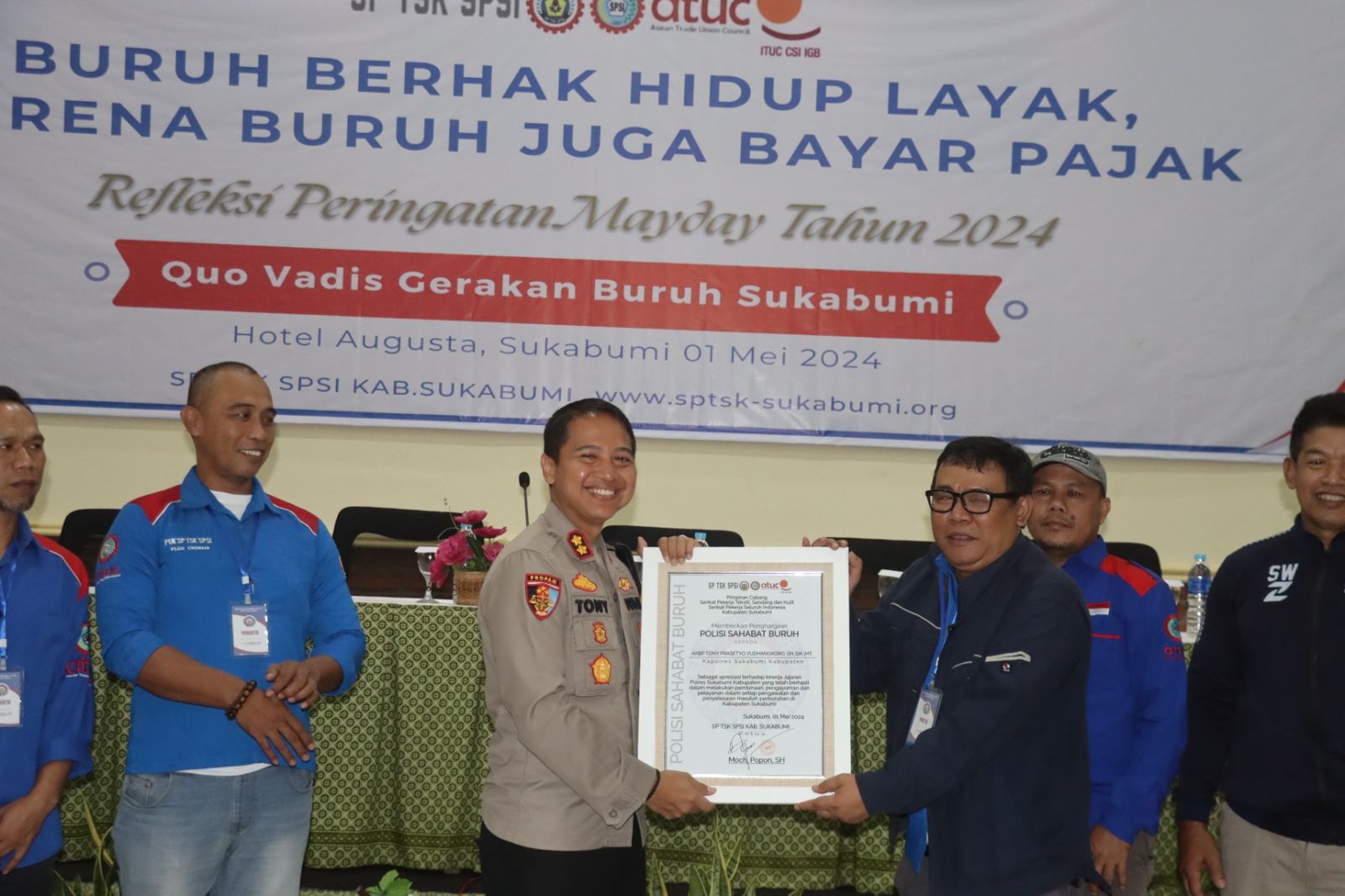FOKUSMEDIANEWS.COM, KAB SUKABUMI – Kapolres Sukabumi AKBP Tony Prasetyo menerima penghargaan sebagai Polisi Sahabat Buruh dari Serikat Pekerja Tekstil, Sandang dan Kulit Serikat Pekerja Seluruh Indonesia Indonesia (SP TSK SPSI) Kabupaten Sukabumi. Penyerahan penghargaan dilaksanakan dalam acara peringatan Hari Buruh Internasional (May Day) di Aula Hotel Augusta Kabupaten Sukabumi, pada hari Rabu (01/05/24), pukul 09.00 WIB.