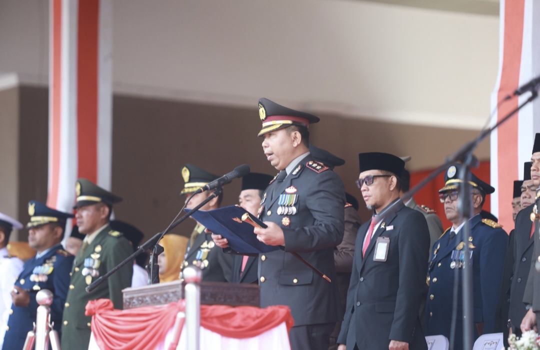 AKBP Dr. H. Samian membacakan naskah Pembukaan Undang-Undang Dasar 1945 dengan penuh semangat dan khidmat, menambah nuansa patriotisme yang menggelora di tengah-tengah upacara.