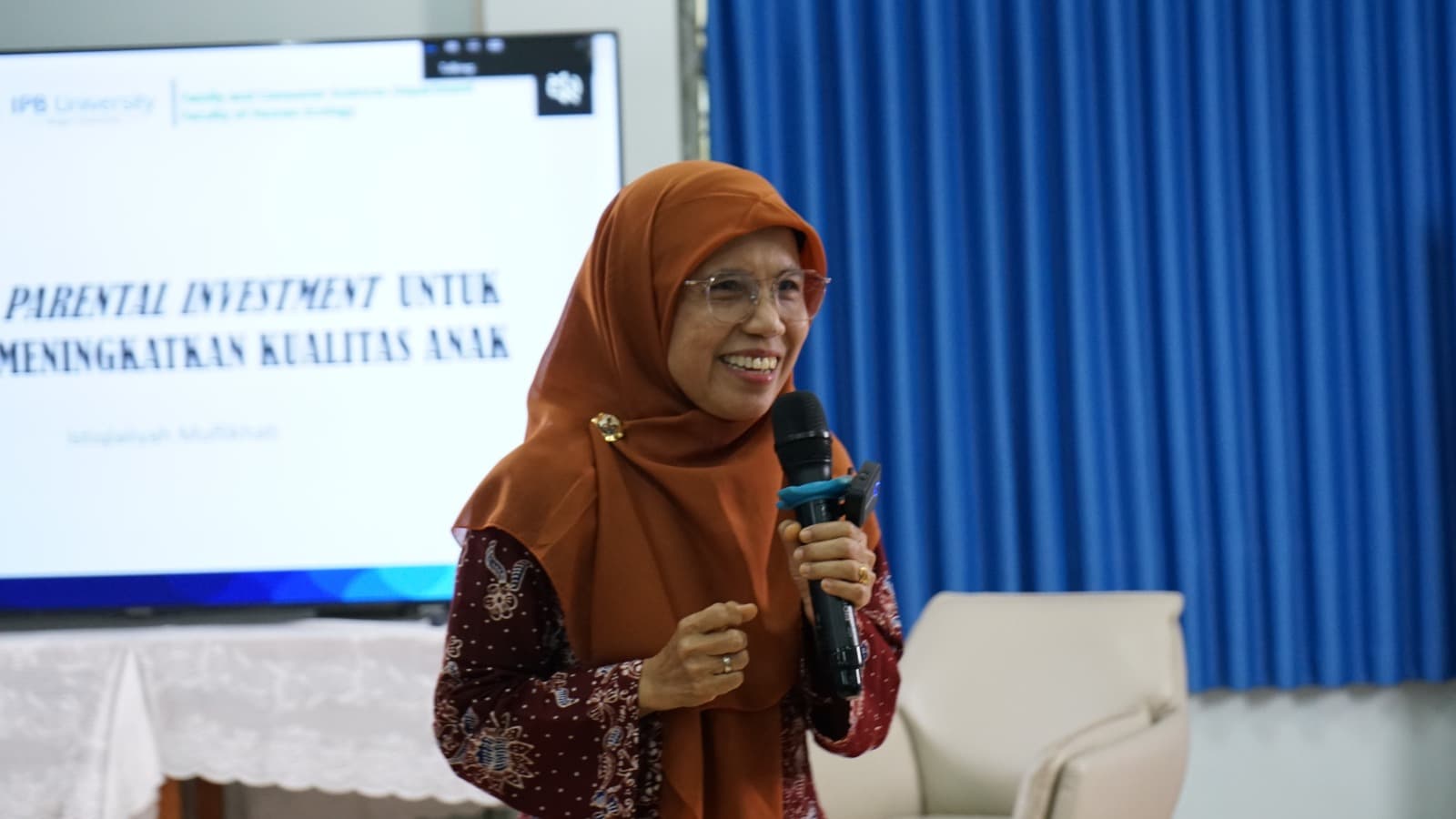 Dr. Ir. Istiqlaliyah Muflikhati, M.Si., menyampaikan materi penting bertajuk Parental Investment untuk Meningkatkan Kualitas Anak. “Parental investment bukan hanya soal biaya, tetapi juga waktu, kasih sayang, perhatian, serta komunikasi berkualitas antara orang tua dan anak. Semua itu sangat menentukan kualitas anak dalam jangka panjang,” tegasnya.