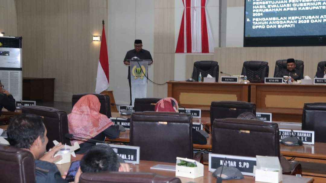 Adapun terkait keputusan Raperda tentang APBD TA 2025 Bupati menyatakan bahwa pemerintah daerah telah menyampaikan nota pengantar keuangan, yang didalamnya terdapat kebijakan umum APBD dan prioritas plafon anggaran sementara tahun 2025. Namun diterbitkannya Perpres tentang rincian APBN tahun anggaran 2025 dan Permendagri tentang pedoman penyusunan APBD TA 2025 harus disesuaikan dengan pemerintah pusat, penetapan APBD TA 2025 mengalami penyesuaian.