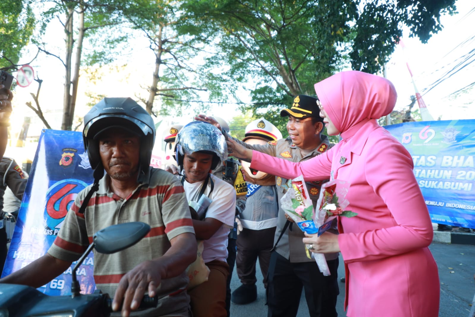 Kapolres menambahkan, bhakti sosial ini dilaksanakan bersama para PJU, pengurus Bhayangkari Cabang Sukabumi, serta Personel Sat Lantas Polres Sukabumi dengan membagikan helm dan bucket berisi makanan secara gratis kepada pengendara sepeda motor yang tidak memakai helm saat berkendara juga kepada anak-anak di sekitar Alun-Alun Palabuhanratu.