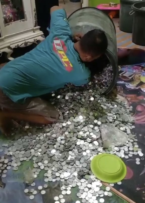 Drum plastik yang sudah tidak muat menampung saat diisi uang koin, karena penuh, kemudian Sodikin berniat membukanya. Dengan dibantu 8 orang yang bertugas menghitung terkumpulan sebanyak Rp 70 juta.